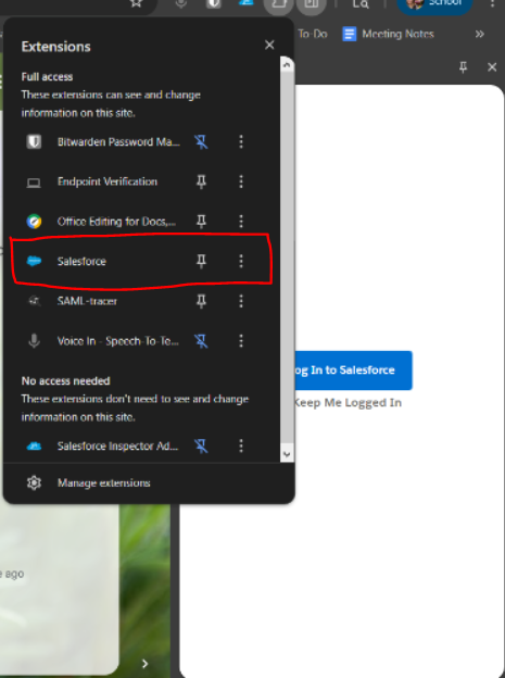 6. You will notice the panel disappear after this. To get it back, click on the extensions icon on the top of the page and select Salesforce. It will then re-appear. This is how you can access it moving forward (you will not need to log in each time). Note: you can pin it to your top toolbar by selecting the pin icon next to it.