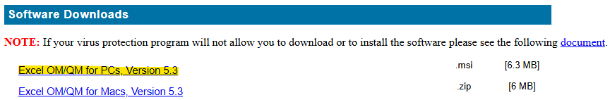 - From the list of Software Downloads, install Excel OM/QM for PCs, Version 5.3
