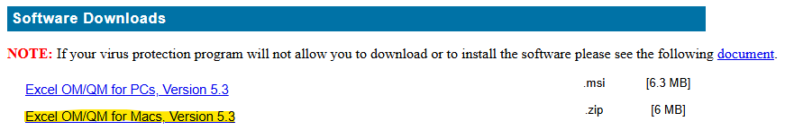 From the list of Software Downloads, install Excel OM/QM for Macs, Version 5.3