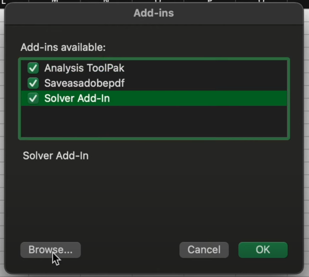 - On the Add-ins window, check Analysis ToolPak and Solver Add-In. Then, click Browse...