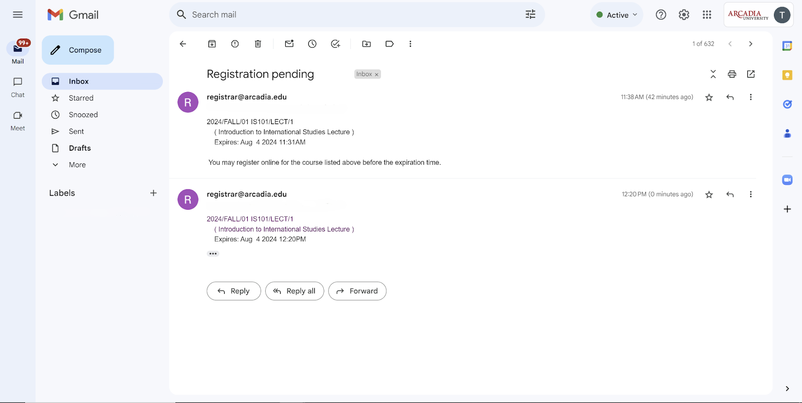 When a seat opens up an email alert is triggered. An email will be sent including the course details and time the seat expires. Students will have 96 hours (4 days) to register before the seat is offered to the next student.