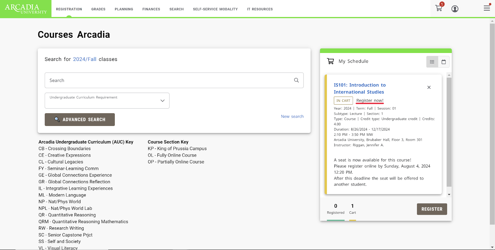 Within the window of time, the Cart in Self-Service displays a seat available for Registration - with message “Register Now!”